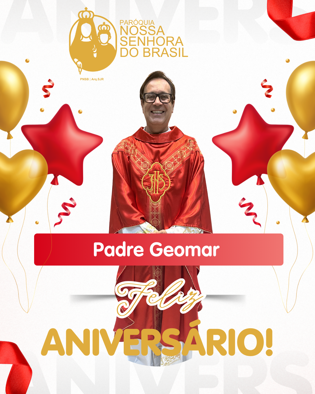 Comunidade celebra o aniversário do Padre Geomar A Paróquia Nossa Senhora do Brasil celebra, com alegria e gratidão, o aniversário do Padre Geomar. Neste dia especial, elevamos a Deus uma ação de graças pelo dom de sua vida, por sua vocação sacerdotal e pelo dedicado serviço prestado à nossa comunidade. Sua missão, marcada pelo zelo pastoral, pela proximidade com os fiéis e pelo amor à Igreja, é motivo de gratidão para todos nós. Que o Senhor continue abençoando abundantemente sua caminhada, concedendo-lhe saúde, sabedoria e perseverança no ministério. Que Nossa Senhora do Brasil o cubra com seu manto e interceda sempre por sua vida e missão. A comunidade paroquial une-se em oração e manifesta seus votos de um feliz e abençoado aniversário.