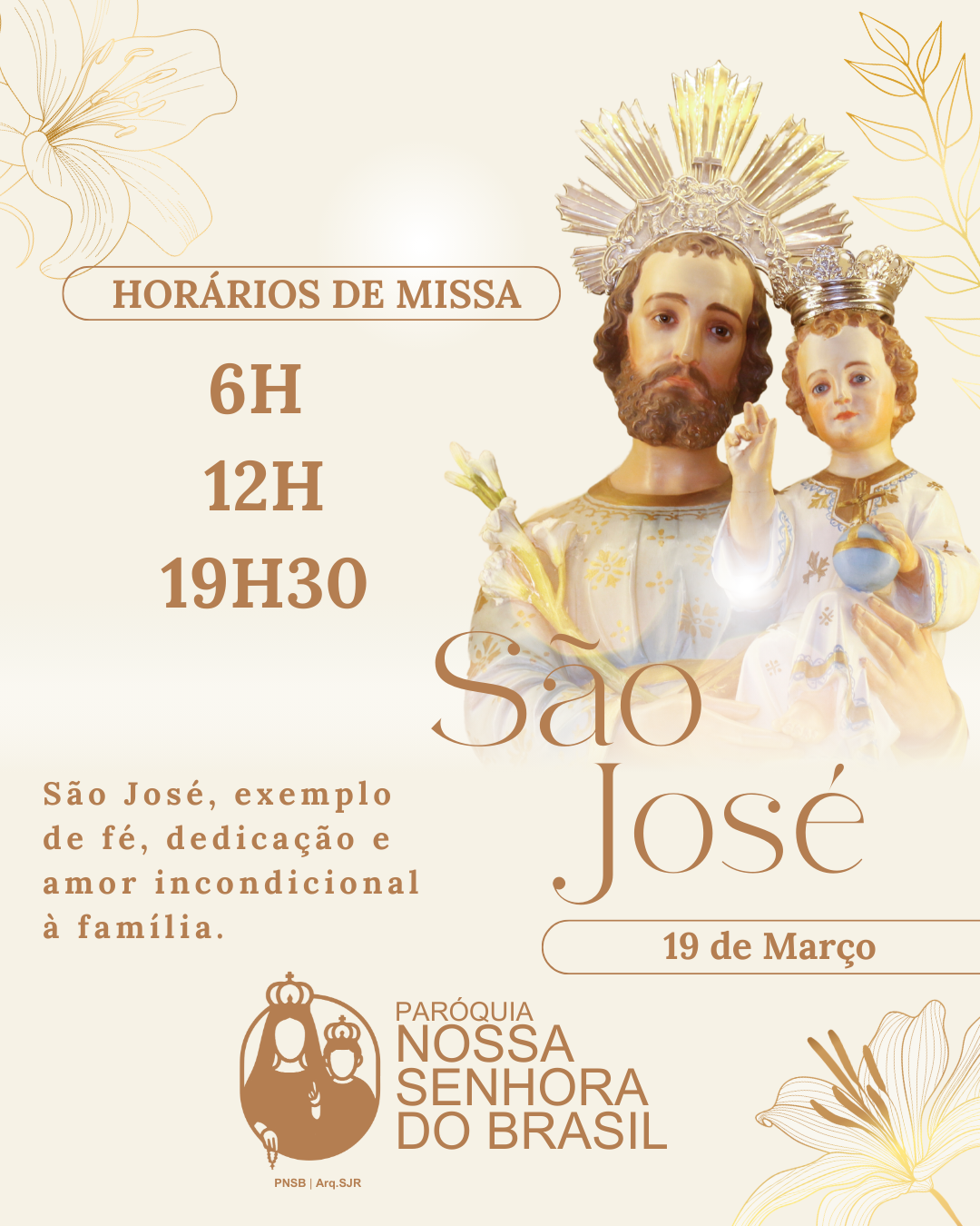 Paróquia Nossa Senhora do Brasil celebra a Solenidade de São José No próximo 19 de março, a Igreja celebra a Solenidade de São José, esposo da Virgem Maria e pai adotivo de Jesus, reconhecido como exemplo de fé, humildade, obediência e dedicação à família. São José é um modelo de confiança em Deus e de serviço silencioso. Sua vida nos ensina a viver com responsabilidade, amor e fidelidade à missão que o Senhor nos confia. A Paróquia Nossa Senhora do Brasil convida toda a comunidade para participar das celebrações em honra a São José. Horários das Missas 06h 12h 19h30 Este será um momento especial de oração, devoção e renovação da fé, confiando a São José nossas famílias, trabalhos e intenções.