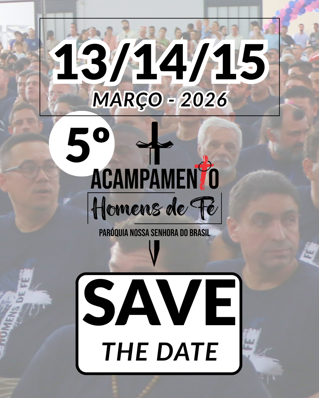 A Paróquia Nossa Senhora do Brasil realizará, nos dias 13, 14 e 15 de março, o 5º Acampamento Homens de Fé, um encontro voltado para homens que desejam fortalecer sua espiritualidade, aprofundar a fé e viver uma experiência de transformação pessoal e comunitária.