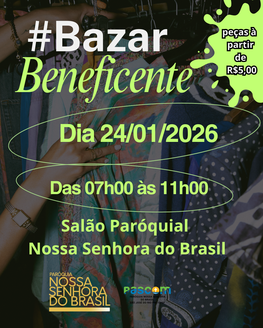 A Paróquia Nossa Senhora do Brasil promove no dia 24 de janeiro de 2026 um Bazar Beneficente, com o objetivo de arrecadar recursos para apoiar as ações pastorais e sociais da comunidade.