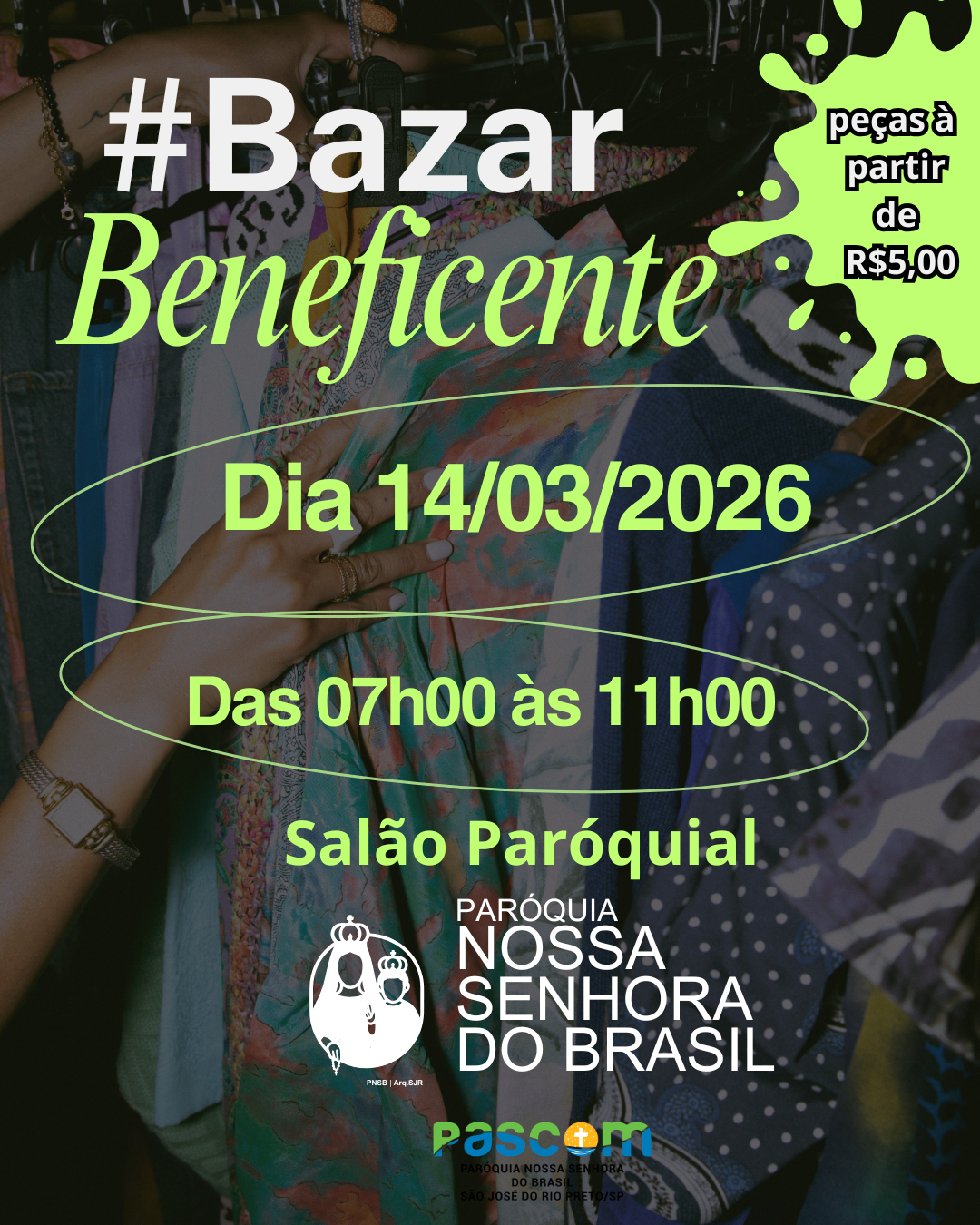 Chegou a hora de renovar o guarda-roupa e ainda ajudar uma causa especial! A Paróquia Nossa Senhora do Brasil realiza um Bazar Beneficente com peças a partir de R$ 5,00.