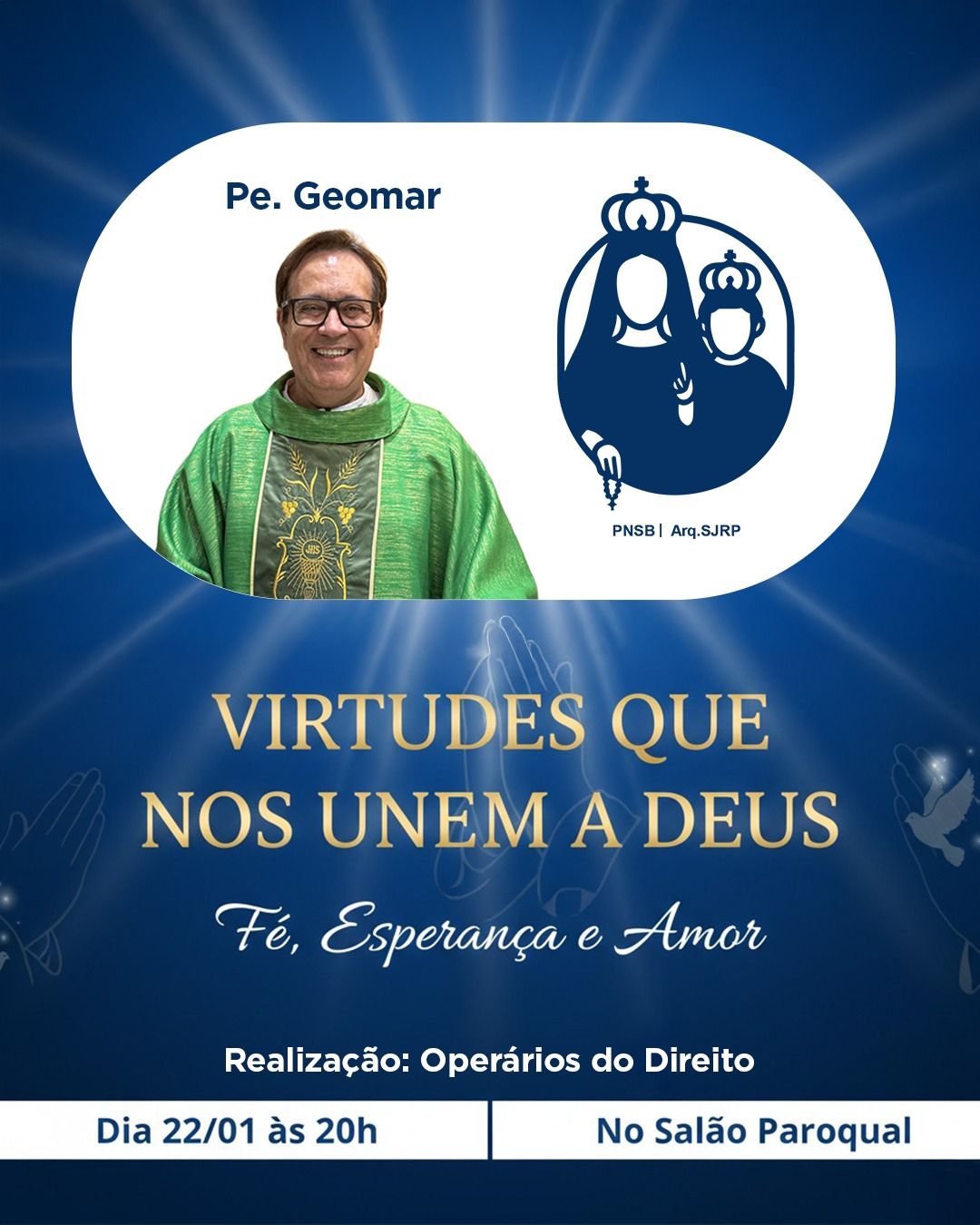 A Paróquia Nossa Senhora do Brasil convida toda a comunidade para participar do encontro “Virtudes que nos unem a Deus”, um momento especial de reflexão e espiritualidade conduzido pelo Pe. Geomar.