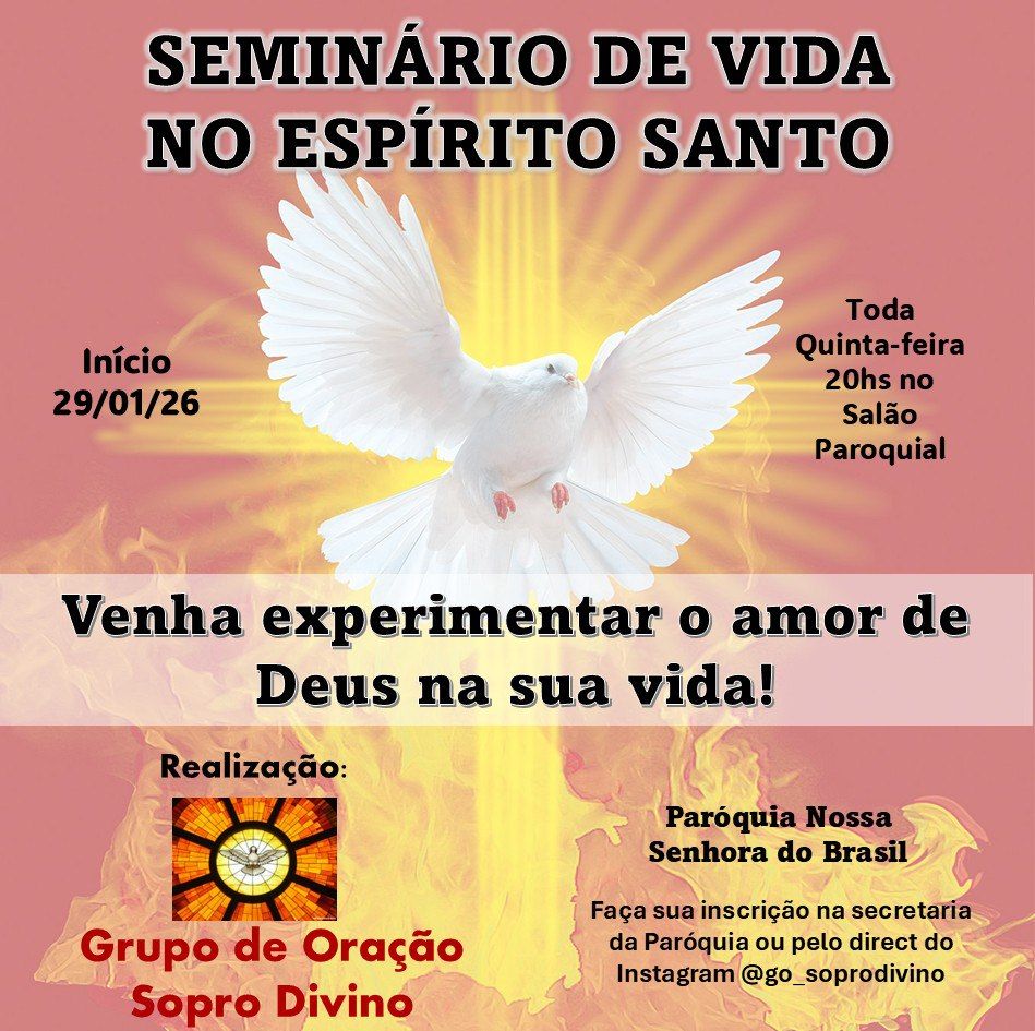 A Paróquia Nossa Senhora do Brasil convida toda a comunidade para participar do Seminário de Vida no Espírito Santo, um tempo especial de encontro com Deus, renovação da fé e abertura à ação do Espírito Santo.