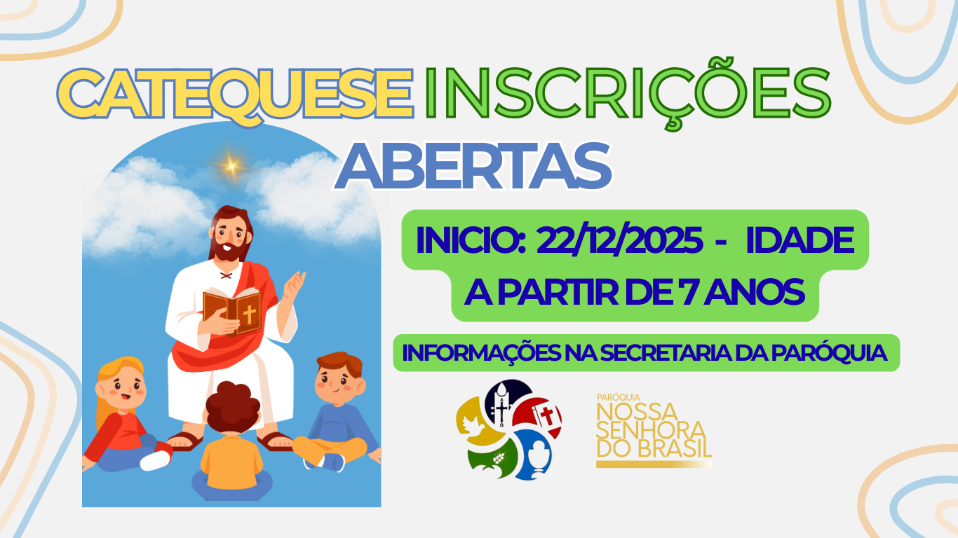 A Paróquia Nossa Senhora do Brasil informa que estão abertas as inscrições para a Catequese 2025, um importante momento de formação cristã, evangelização e fortalecimento da fé de nossas crianças e adolescentes.